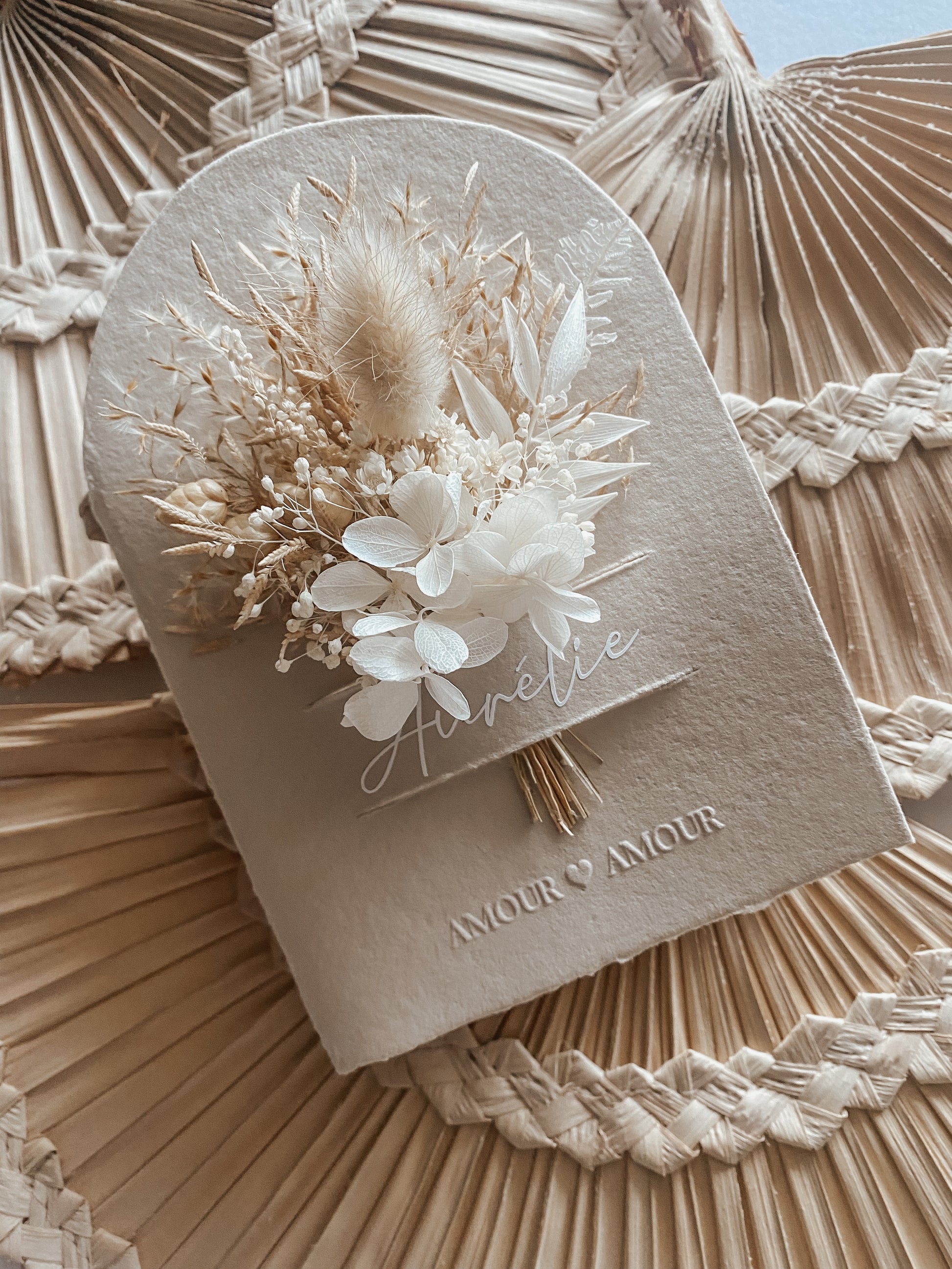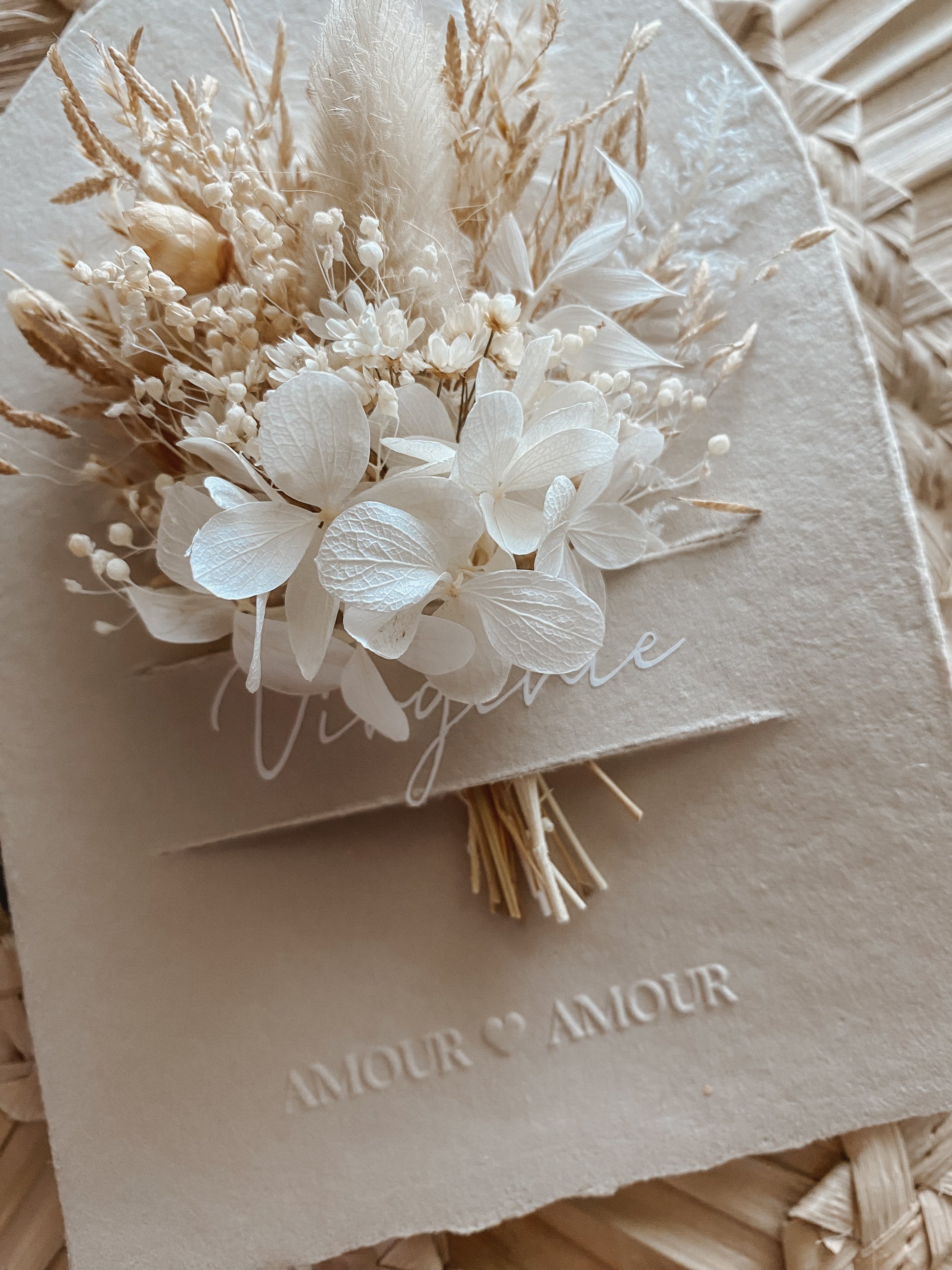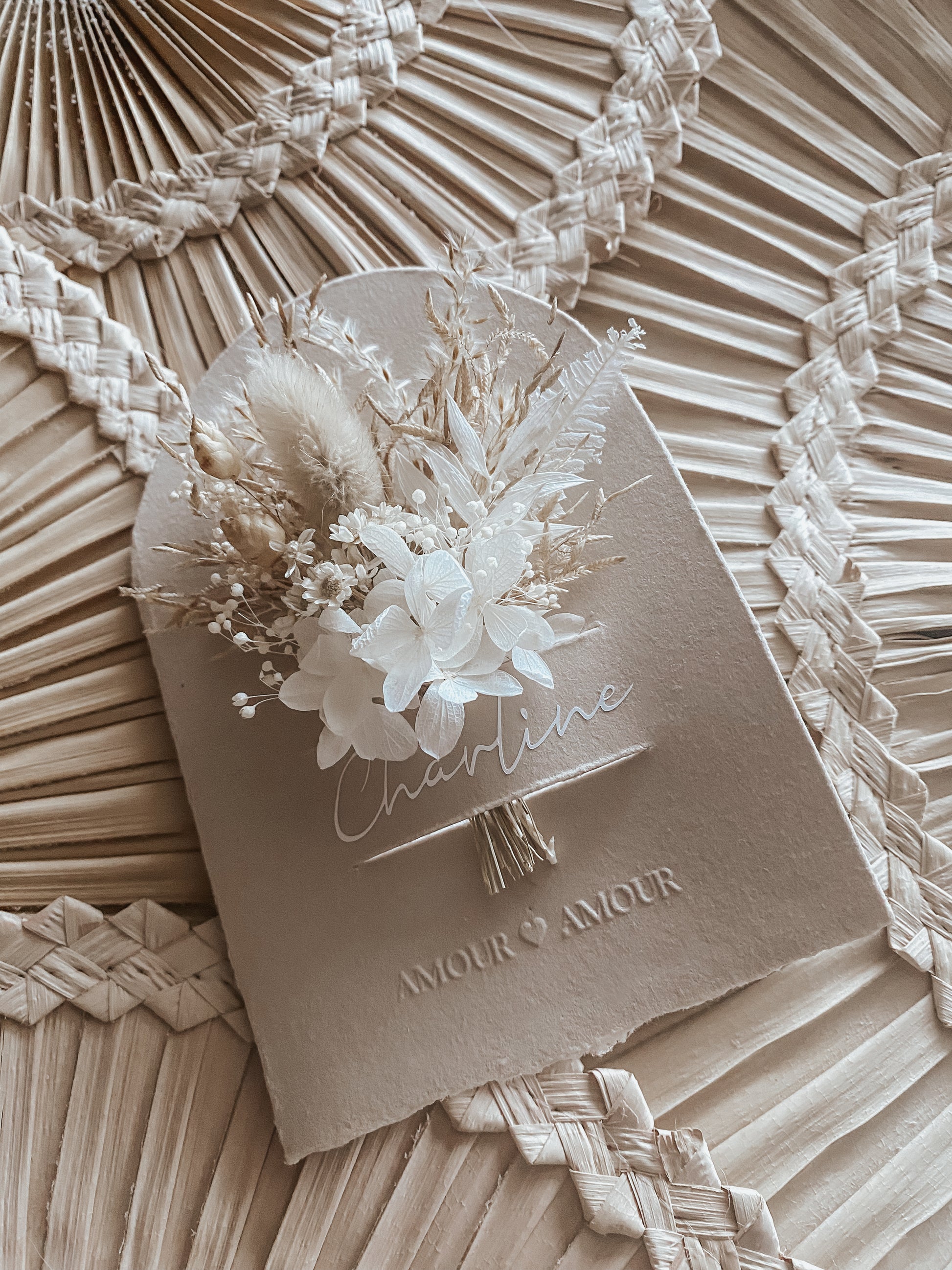 Elle est composée d'un mini-bouquet et d'une feuille en papier artisanal pour écrire votre message.