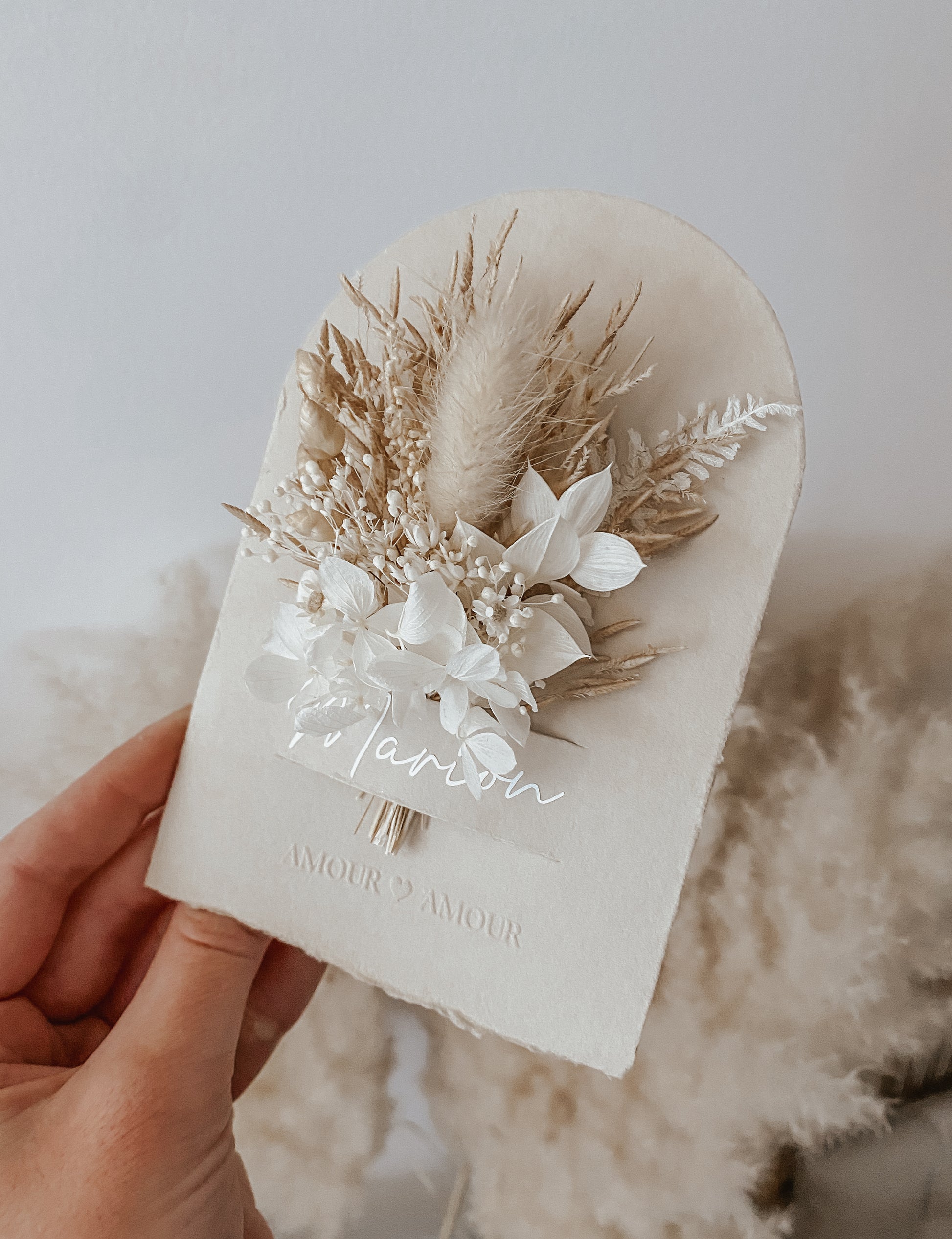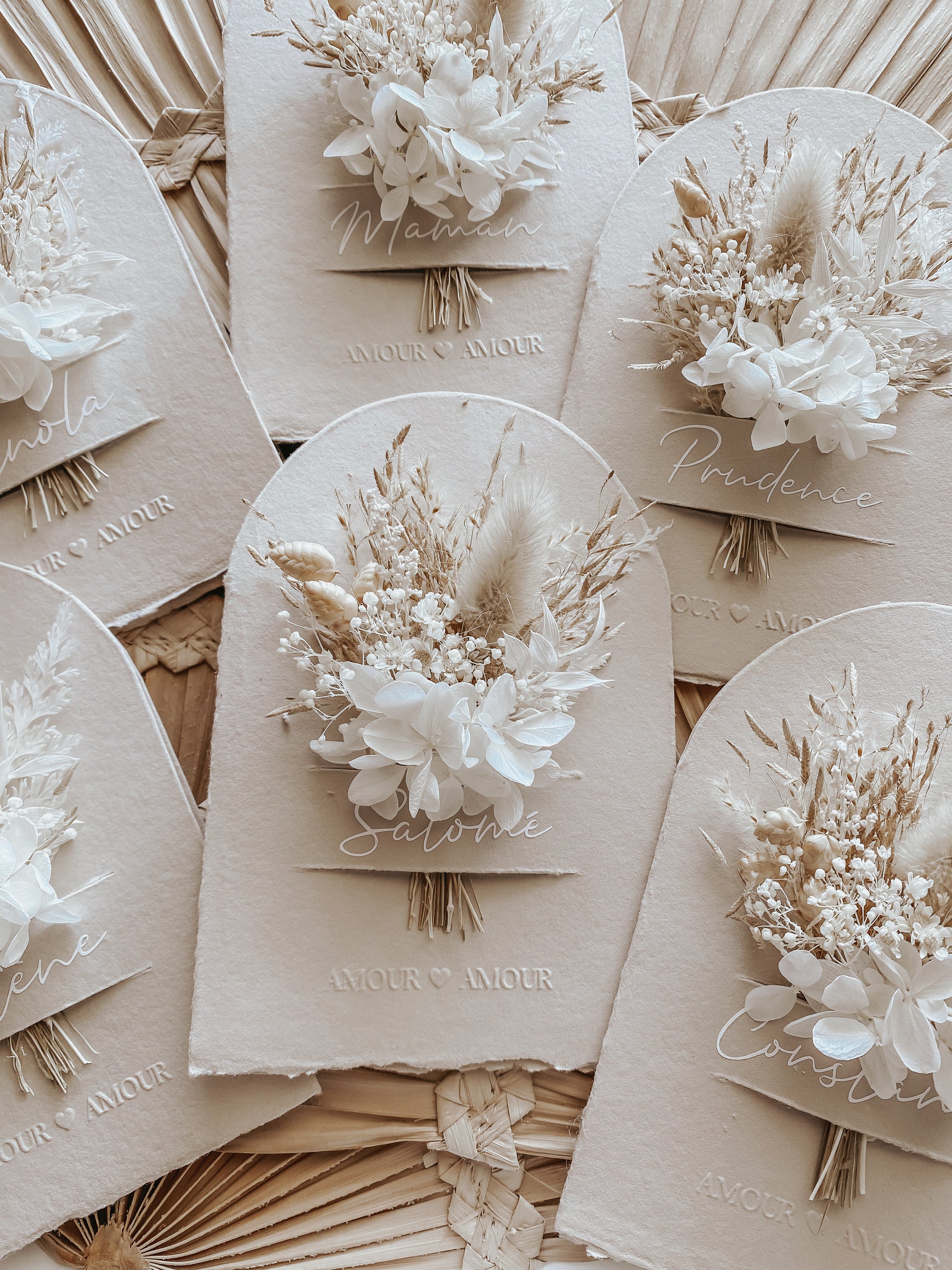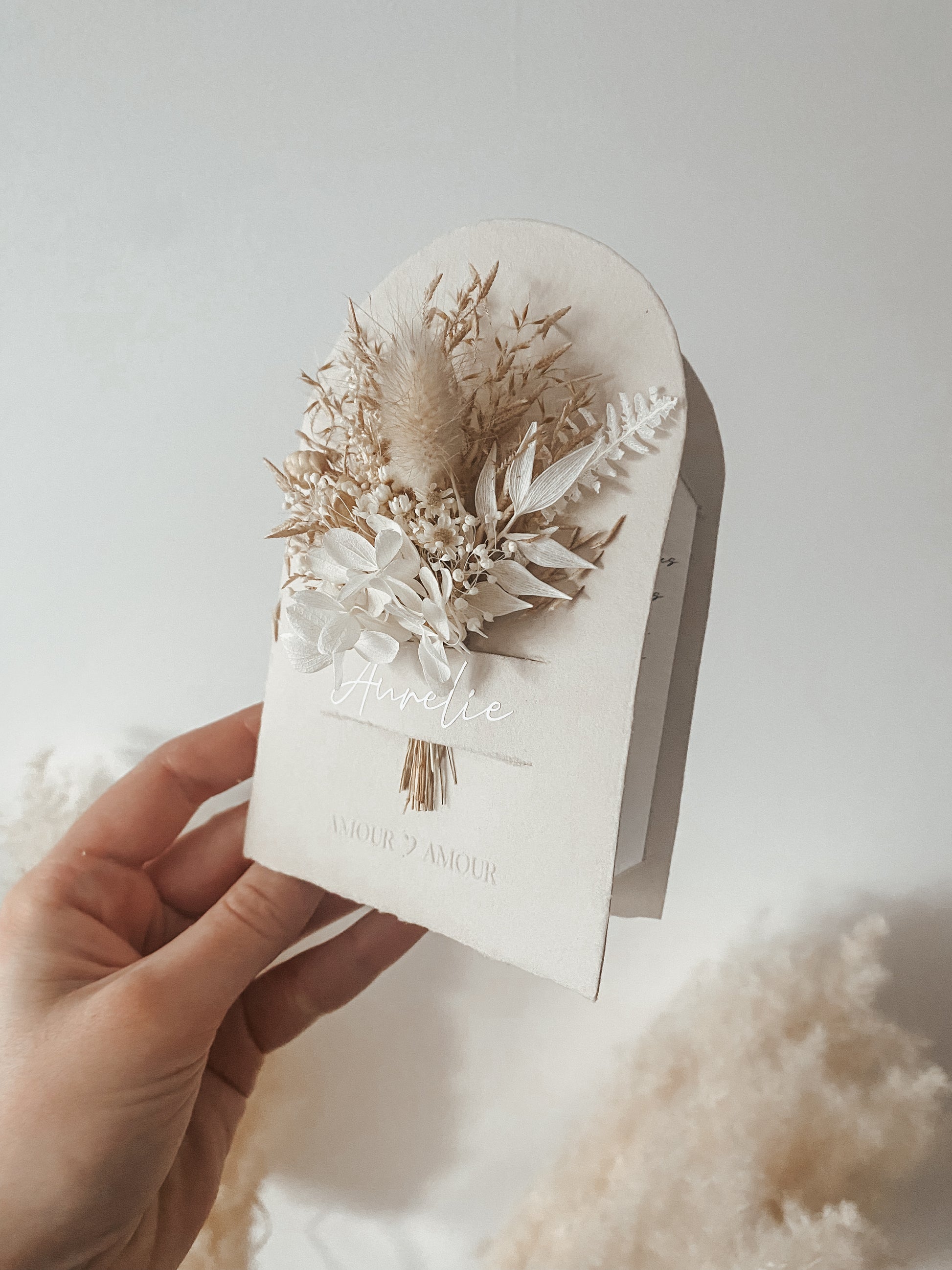 Elle est composée d'un mini-bouquet et d'une feuille en papier artisanal pour écrire votre message.